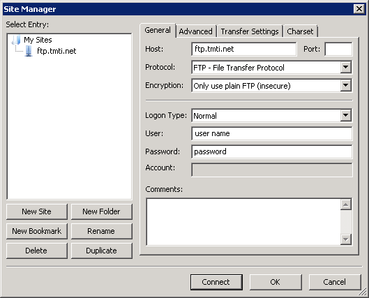 To use this site please use a FTP client such as FileZilla. Which can be obtained from https://filezilla-project.org/download.php?show_all=1 Example settings are below.